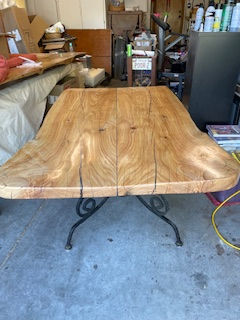 The Cypress tree was harvested shortly after the October 2021, Alisal Fire near Santa Barbara and later discovered by the artist in 2023. From this fire-scarred timber emerged a tabletop that woodworkers dream of—a dramatic live-edge bookfold design. The finished piece, weighing 164 lbs with its 1968 wrought iron base, carries within it both the resilience of nature and the hand of the craftsman.