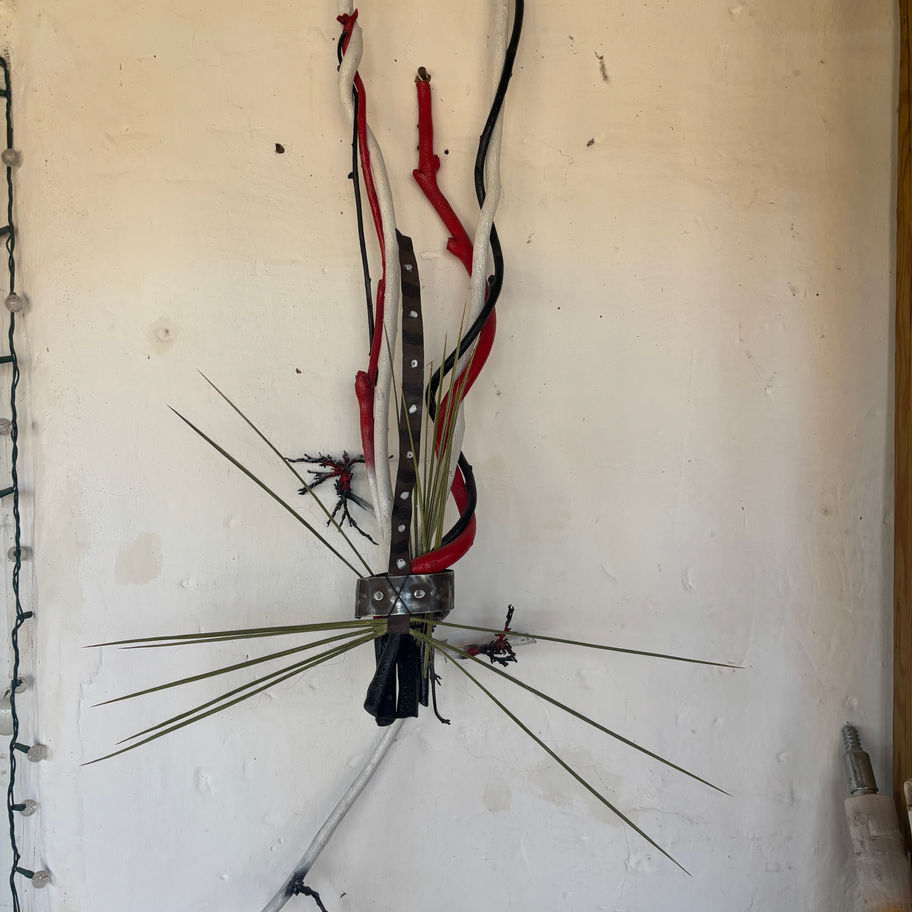 In New Mexico, surrounded by harsh textures and resilient flora, I paired the Wisteria with elements native to the landscape: Yucca and steel. The result is a mask a form both symbolic and direct. It is meant to capture attention, to confront, to speak without words.