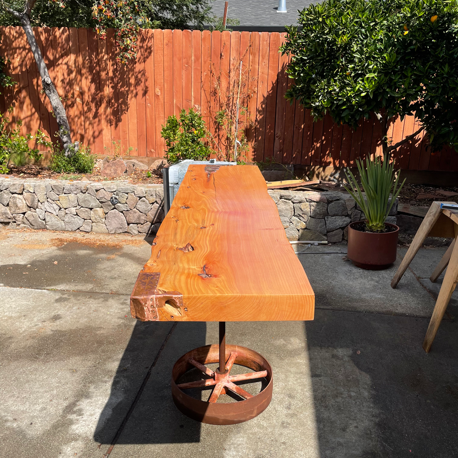This piece began its life as a skateboard ramp at the “Turtle Church” in Sonoma, where hundreds of riders carved their lines over the years. The stack of slabs available there weathered decades, much like the trees that once stood across Sonoma County.